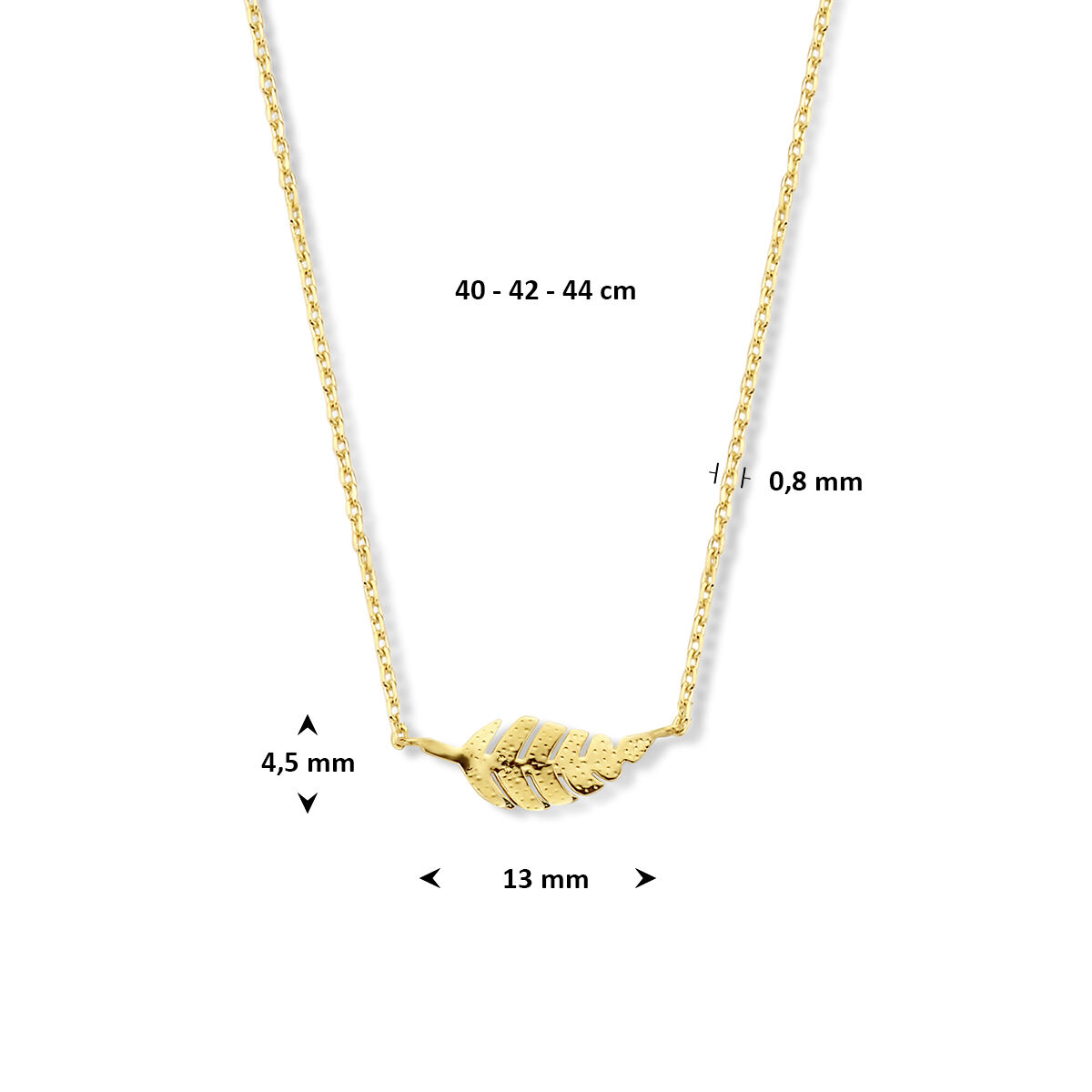 9k Geel kleurige collier uitgevoerd met een veer. Het collier heeft draaglengte van 40-42-44cm.
