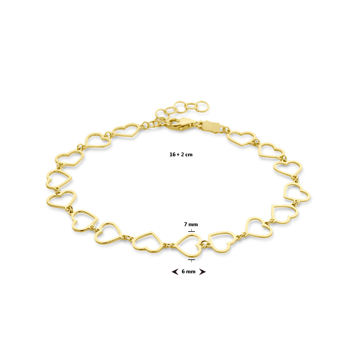 14k Geelgouden armband uitgevoerd met hartjes. De armband heeft een draaglengte van 16cm met 2cm extensie en is uitgevoerd met karabijnsluiting.