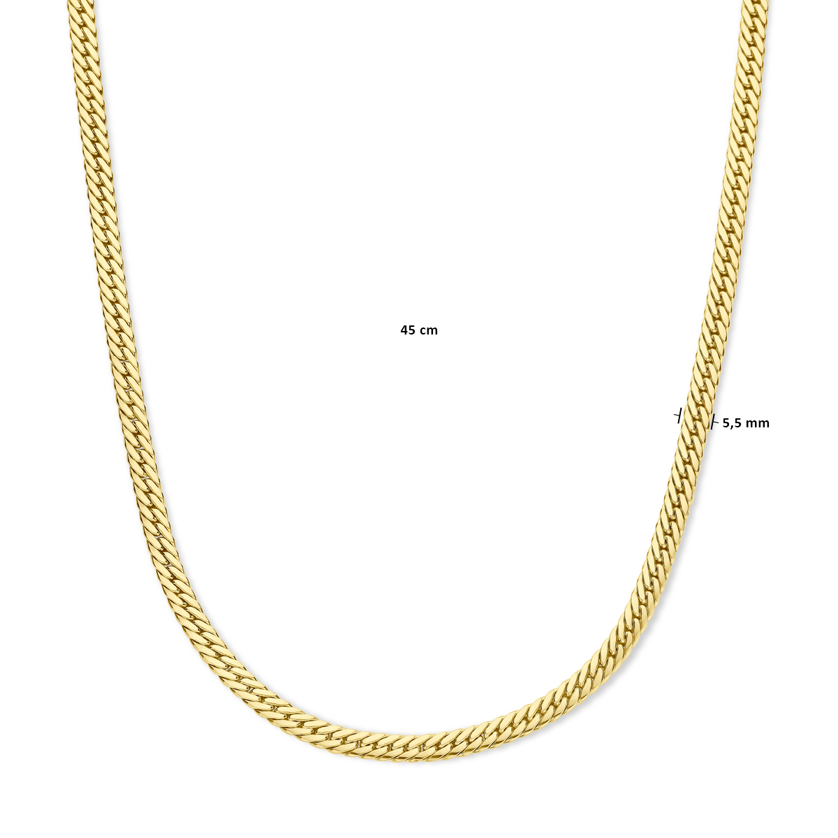 14k Geelgouden collier met een gourmette schakel van 5.5mm. Het collier heeft een draaglengte van 45cm en is uitgevoerd met karabijnsluiting.