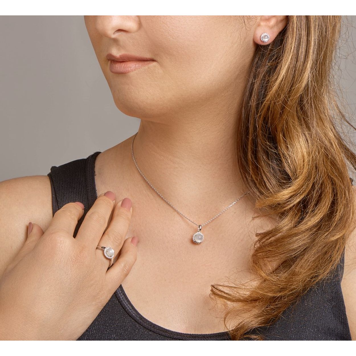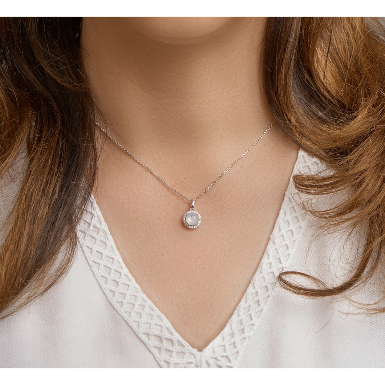 Gerhodineerd zilveren collier uitgevoerd met een ronde hanger met schitterende zirkonia, een wit maansteen en een stevige karabijn sluiting. Het collier heeft een draaglengte van 41cm en een extensie van 4cm.