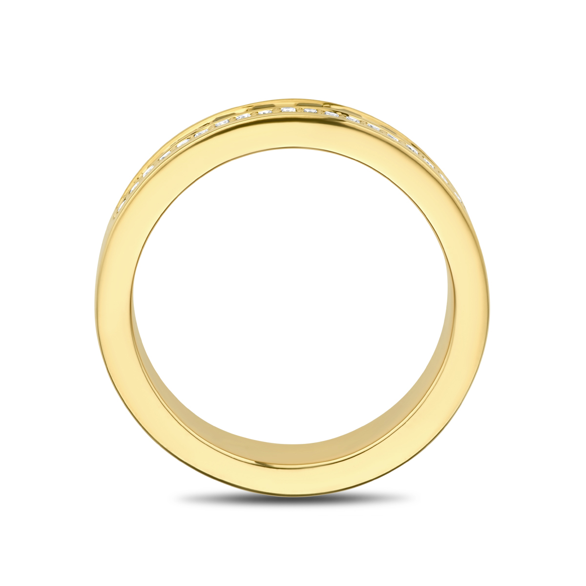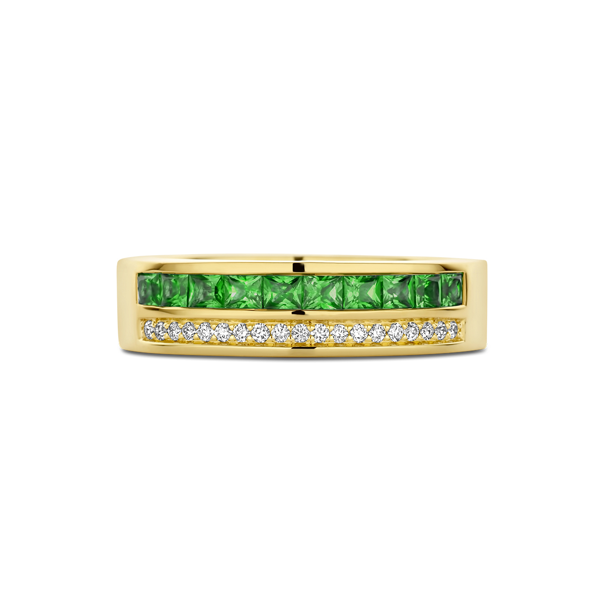 14k Geelgouden ring uitgevoerd met schitterende smaragd en diamant. De ring heeft een breedte van 5.5mm. De smaragd heeft een steengewicht van 0.72ct en het diamantgewicht is 0.12ct.