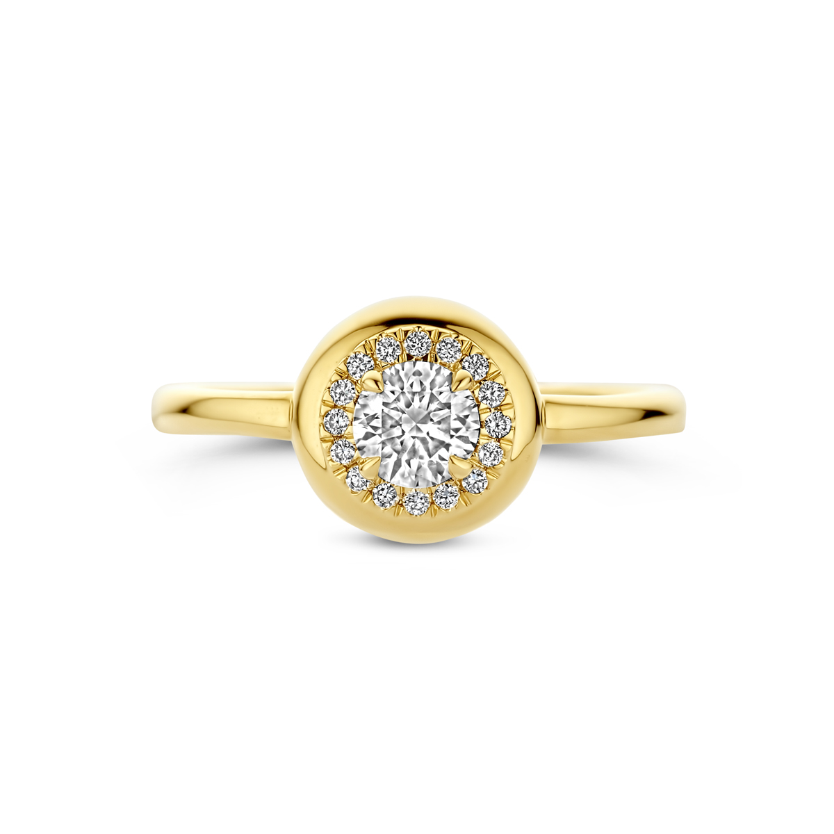 14k Geelgouden ring uitgevoerd met lab grown diamant. De ring heeft een breedte van 9mm. Het totale diamantgewicht is 0.495ct. Lab grown diamanten zijn diamanten die ontstaan in een laboratorium. Onder extreem hoge druk en temperatuur wordt het natuurlijk ontstaansproces nagebootst met als eindresultaat een diamant met dezelfde chemische eigenschappen maar met een andere oorsprong.
