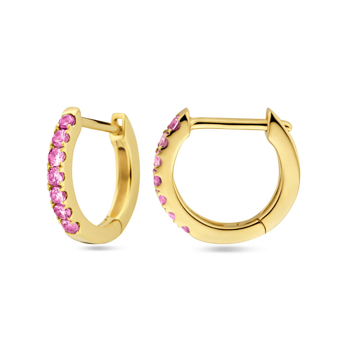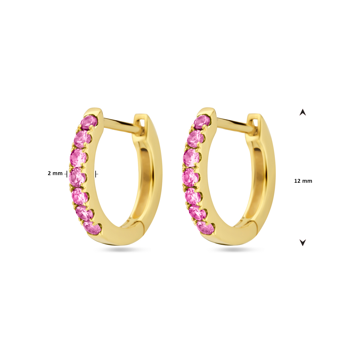 14k Geelgouden klapoorringen uitgevoerd met roze saffier. De klapoorringen hebben een afmeting van 12x2mm.