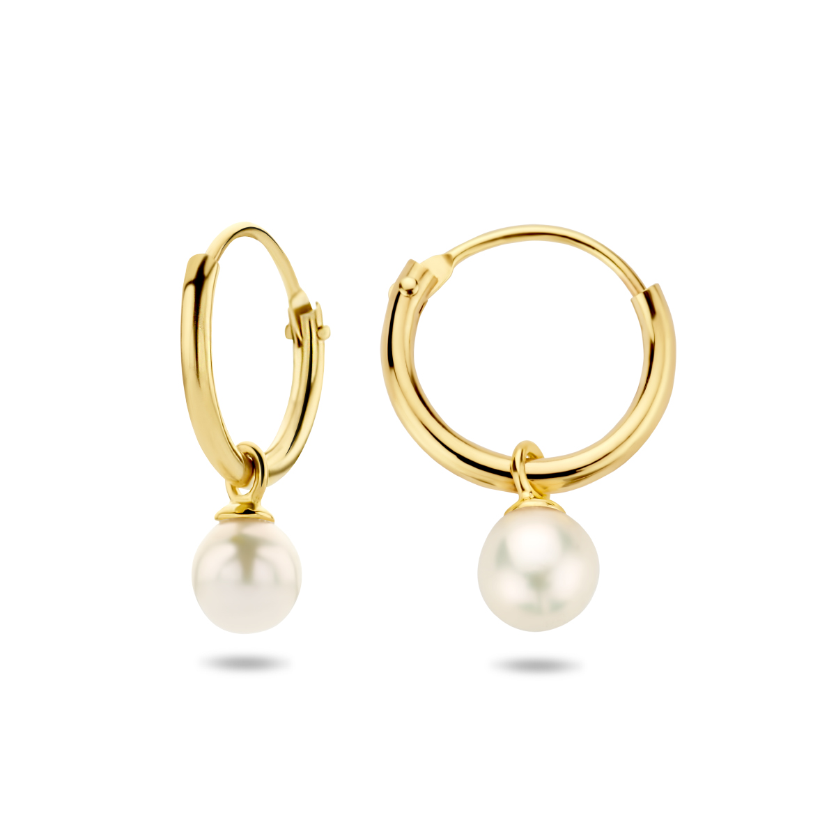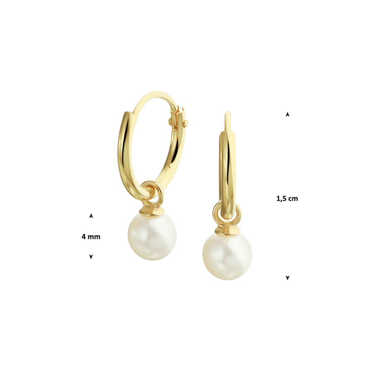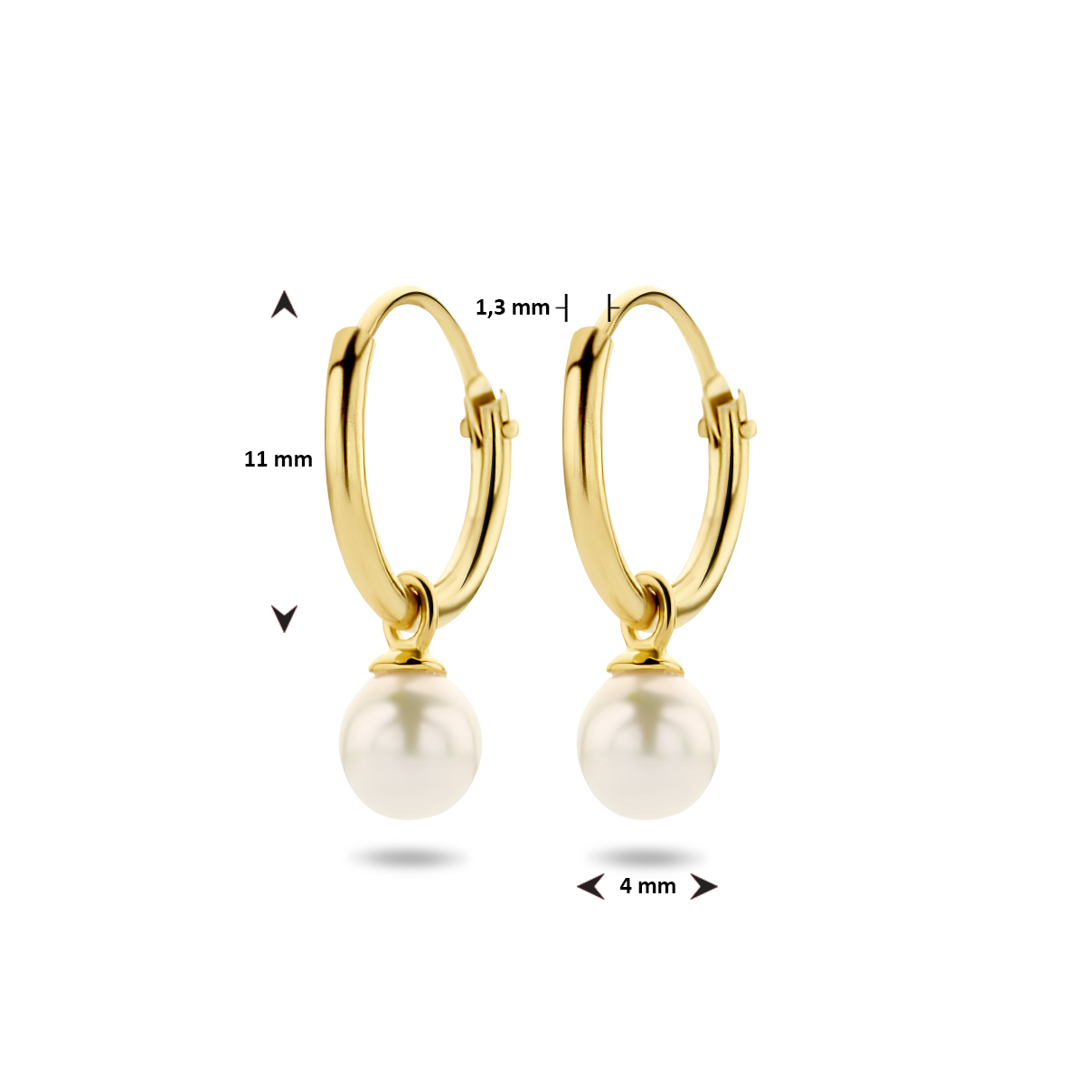 Trendy geelgouden oorringen met een schitterende zoetwaterparel. De oorringen hebben een afmeting van 11x1.3mm met een parel van 4mm. Tip: Leuk om kado te geven! De oorringen hebben een subtiele uitstraling en kunnen dagelijks gedragen worden.