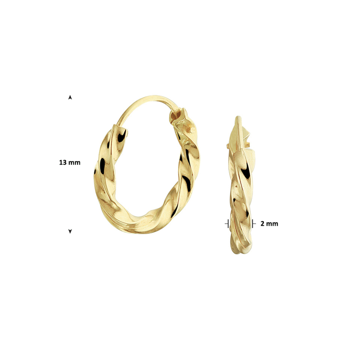 Klassieke geelgouden oorringen met een afmeting van 13x2mm uitgevoerd met een gedraaide buis. Door de eenvoud en het verfijnde ontwerp kunnen deze oorringen perfect worden gedragen met andere sieraden.