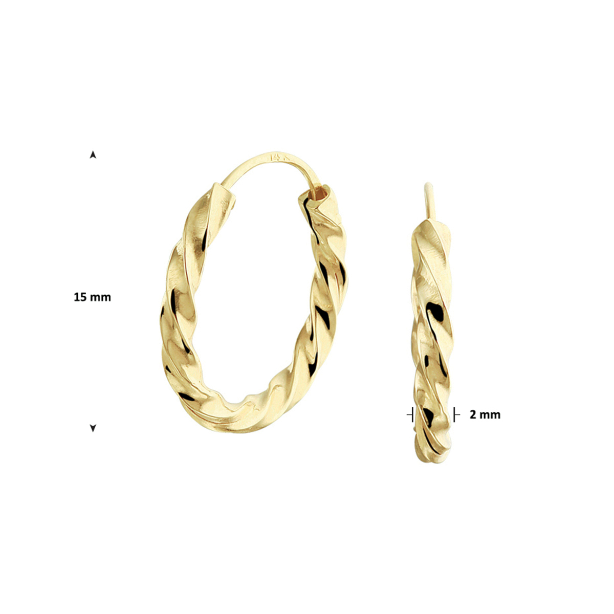 Klassieke geelgouden oorringen met een afmeting van 15x2mm uitgevoerd met een gedraaide buis. Door de eenvoud en het verfijnde ontwerp kunnen deze oorringen perfect worden gedragen met andere sieraden.