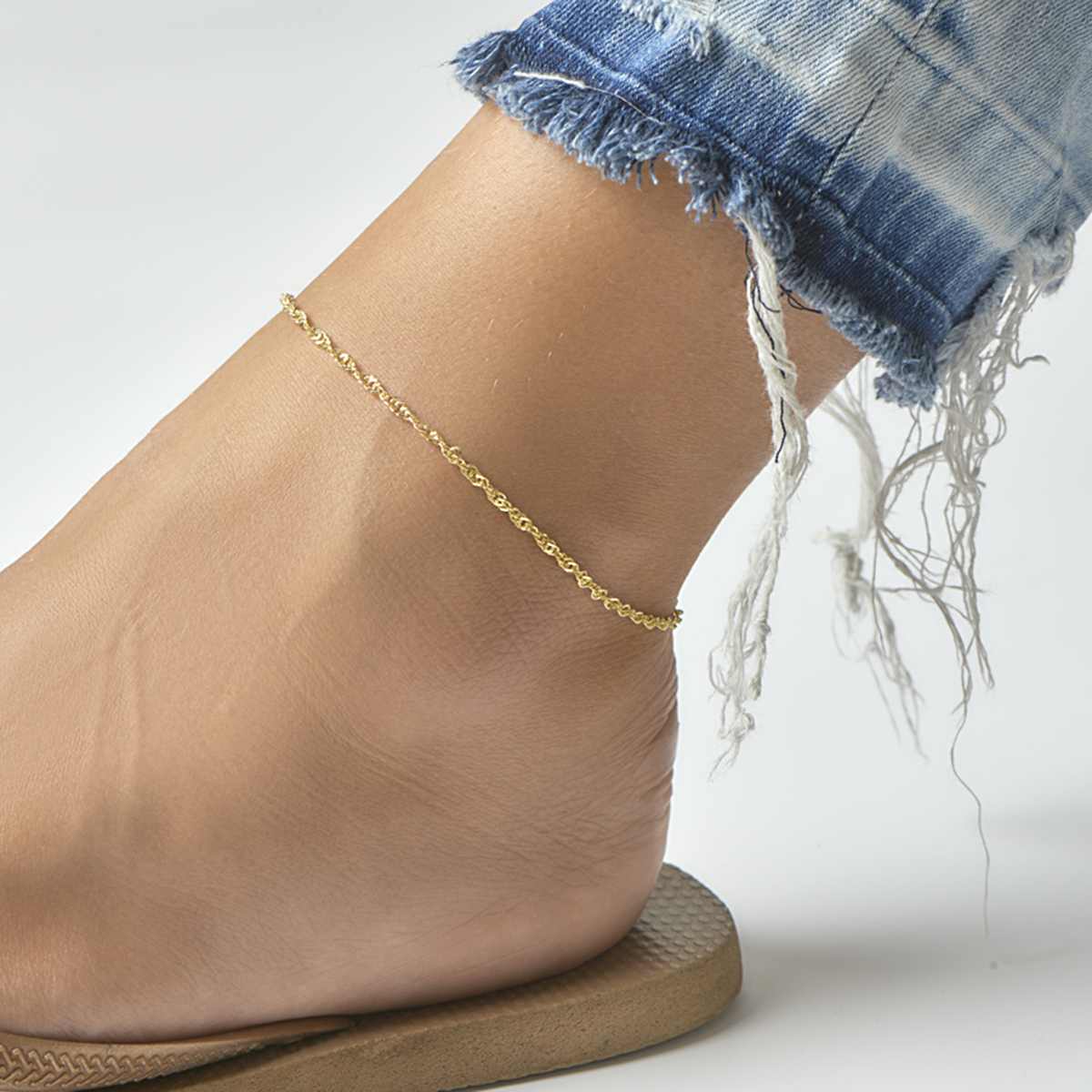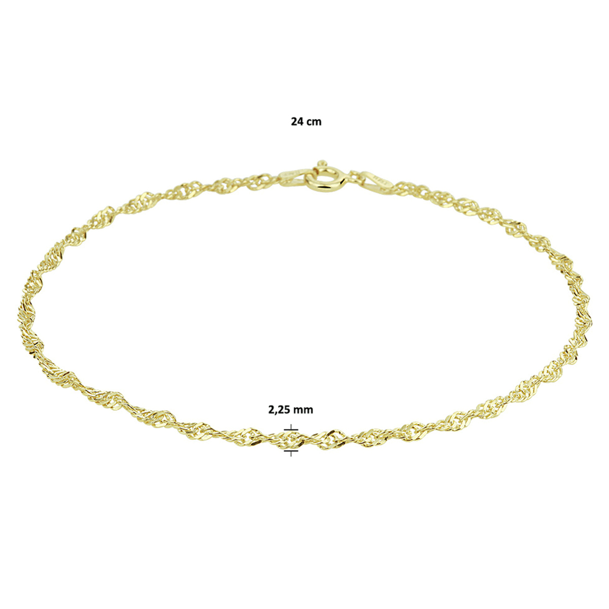 Stijlvol geelgoud op zilveren enkelbandje met een singapore schakel. De schakelbreedte is 2.25mm en de draaglengte 24cm.