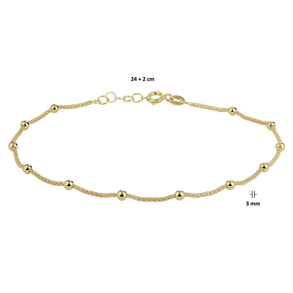 Trendy geelgoud op zilveren enkelbandje uitgevoerd met poli afgewerkte bolletjes van 3mm. Met een draaglengte van 24cm en een extensie van 2cm. Tip: Leuk om kado te geven! Geen garantie op plating.
