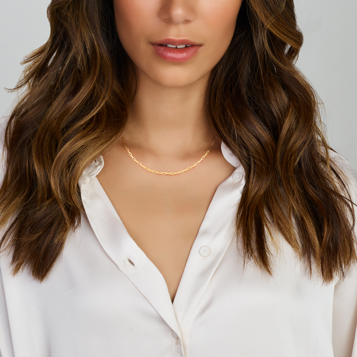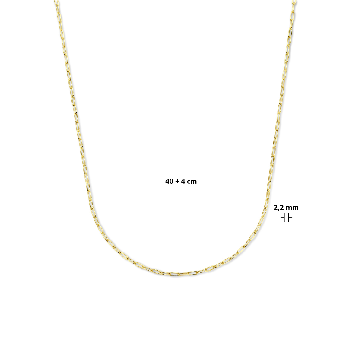 Verguld op 925 zilveren paperclip collier uitgevoerd met een karabijnsluiting. Het collier heeft een schakelbreedte van 2.2mm. Geen garantie op plating.