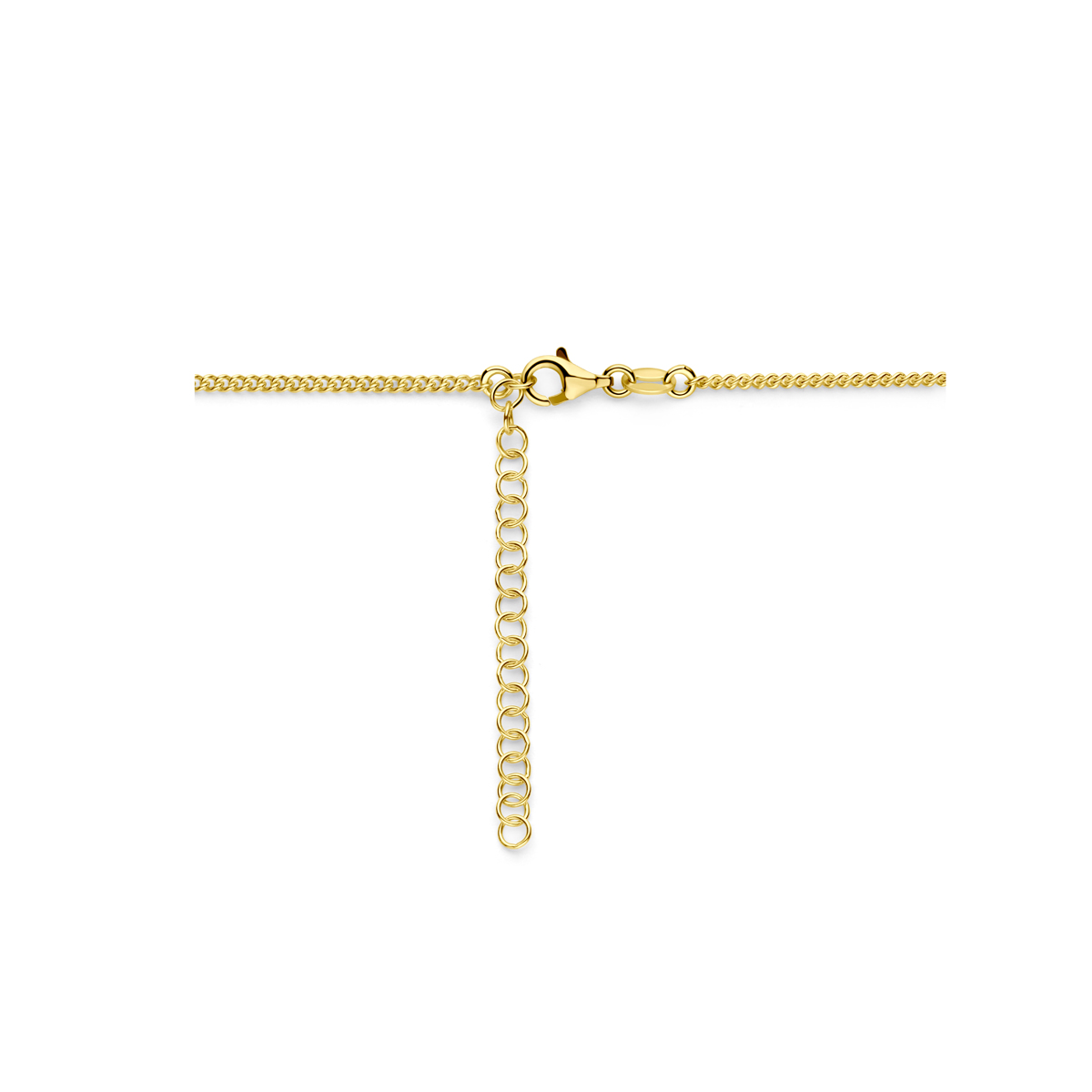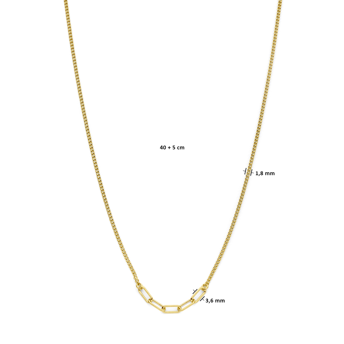 Verguld op 925 zilveren collier met een draaglengte van 40cm met 5cm extensie. Het collier heeft schakelbreedtes van 1.8mm en 3.6mm. Uitgevoerd met karabijnsluiting. Geen garantie op de plating.