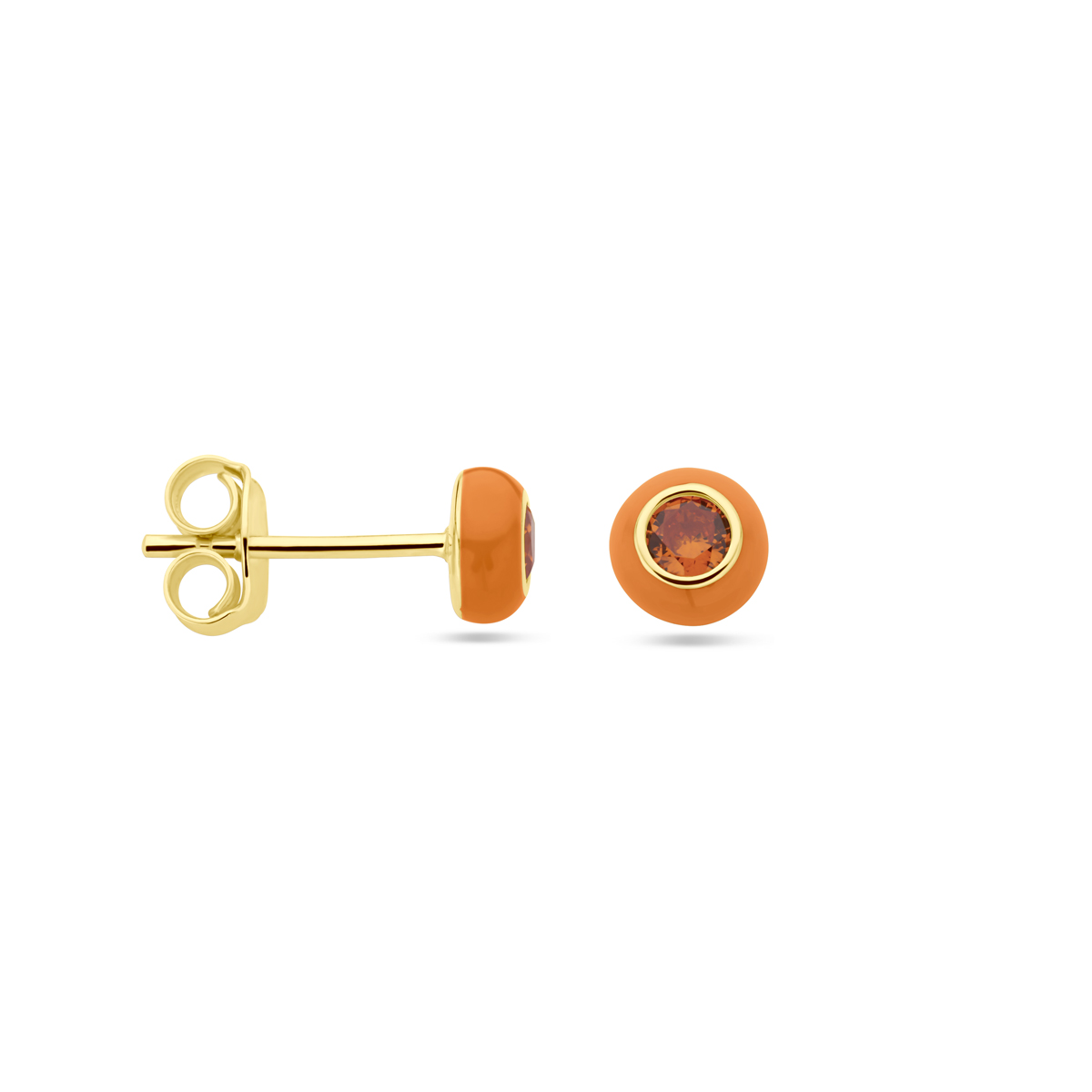 Geelgoud op 925 zilveren oorknoppen uitgevoerd met oranje emaille en oranje zirkonia. De oorknoppen hebben een diameter van 5,5mm. Geen garantie op plating.