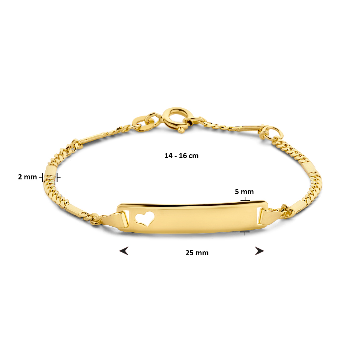 14k Geelgouden graveerarmband. De armband heeft een schakelbreedte van 2mm. De plaat heeft een afmeting van 5x25mm en een dikte van 0.8mm.