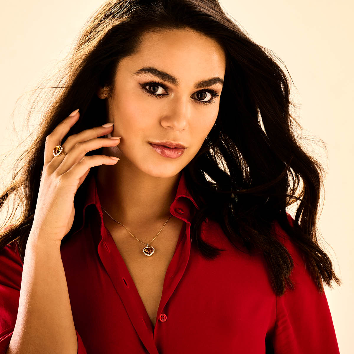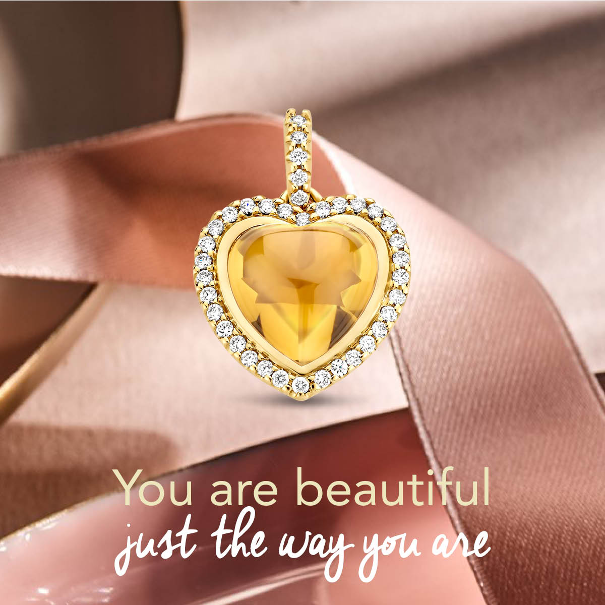 14k Geelgouden hanger in de vorm van hart met een schitterende diamant rij en een citrien. De hanger heeft een totale hoogte van 2.1cm.