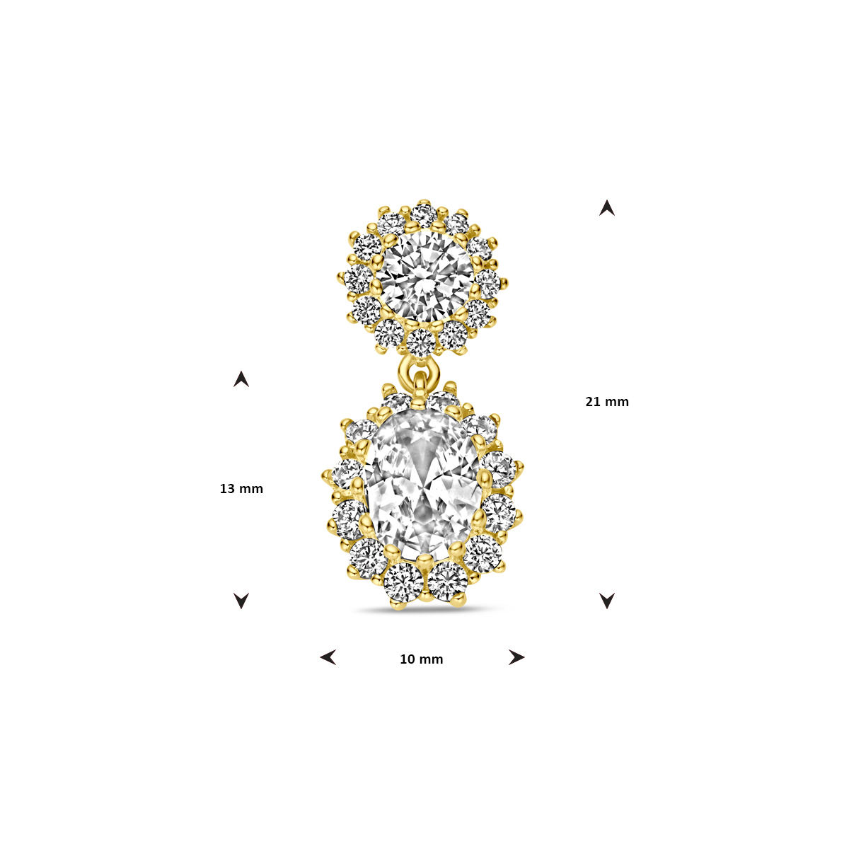 Geelgoud op 925 zilveren hanger uitgevoerd met zirkonia. De hanger heeft een totale hoogte van 21mm. Geen garantie op de plating.