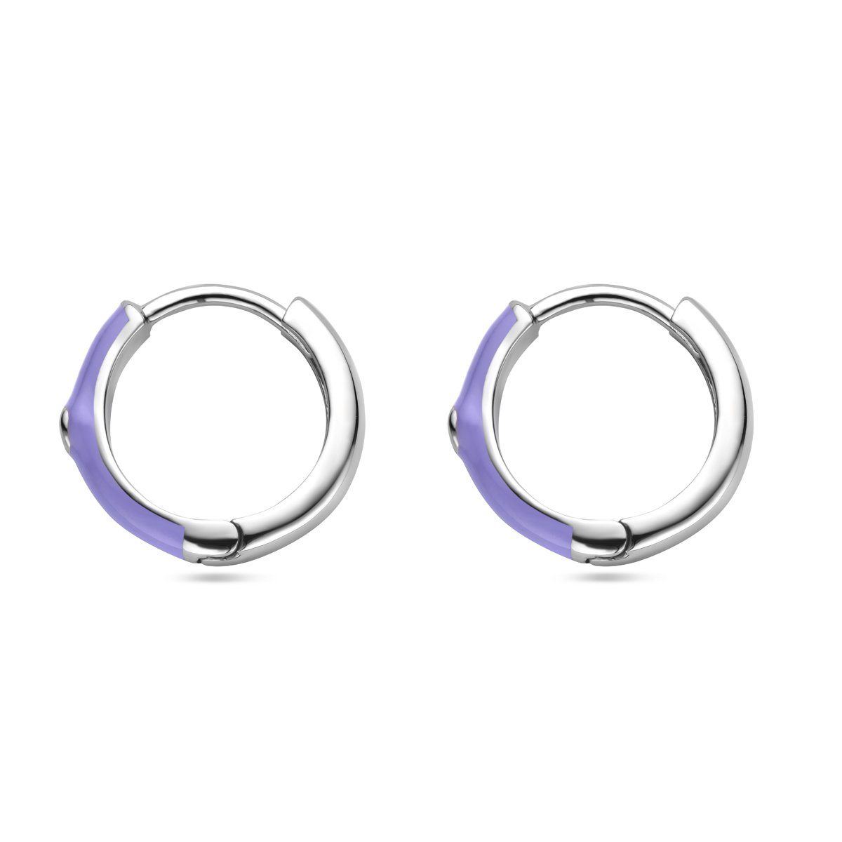 Gerhodineerd 925 zilveren klapoorringen uitgevoerd met zirkonia en paars emaille. De klapoorringen hebben een afmeting van 15x2.5mm.