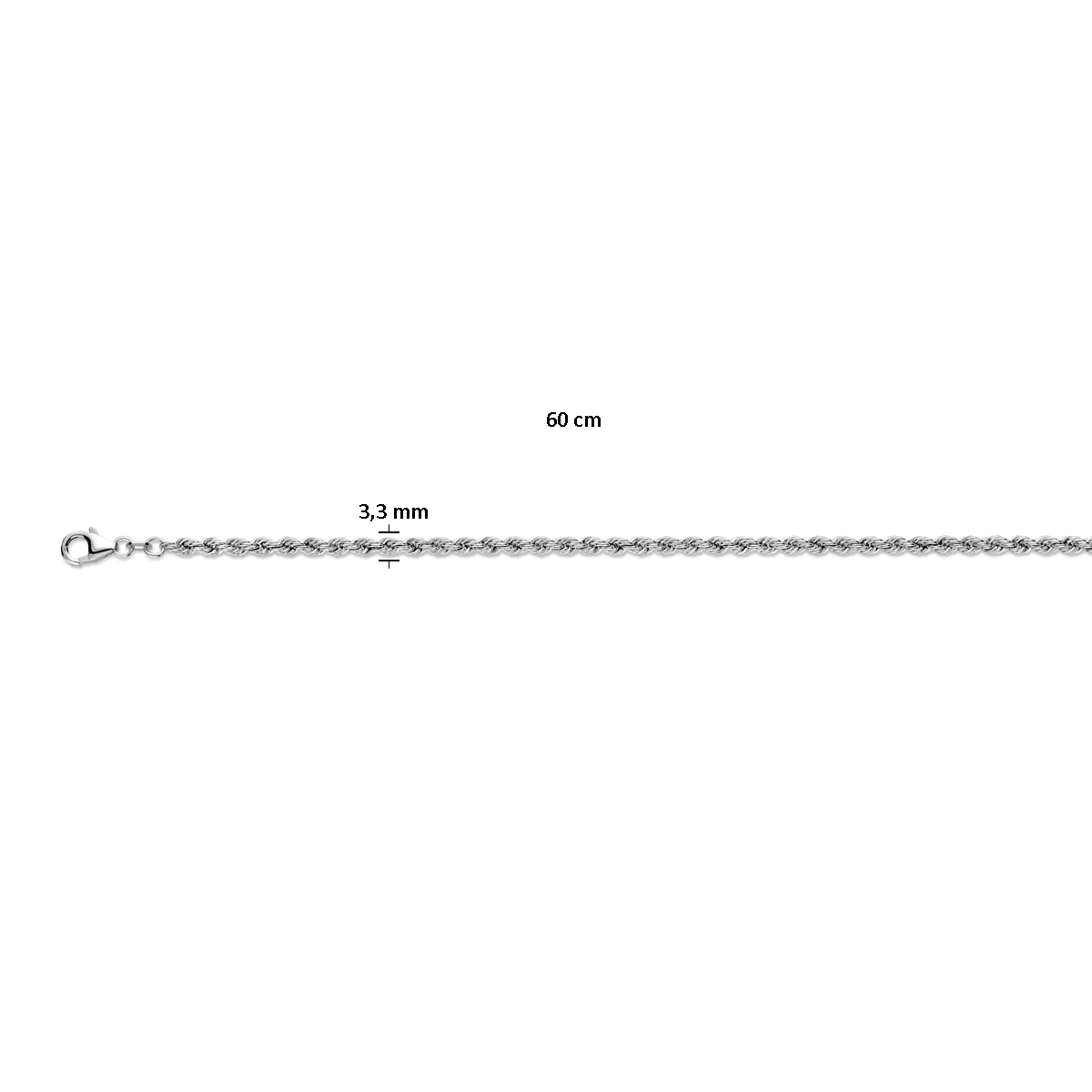 Gerhodineerd 925 zilveren lengte artikel met koord schakel. De schakelbreedte is 3.3mm en is uitgevoerd met karabijn sluiting.
