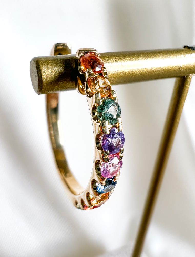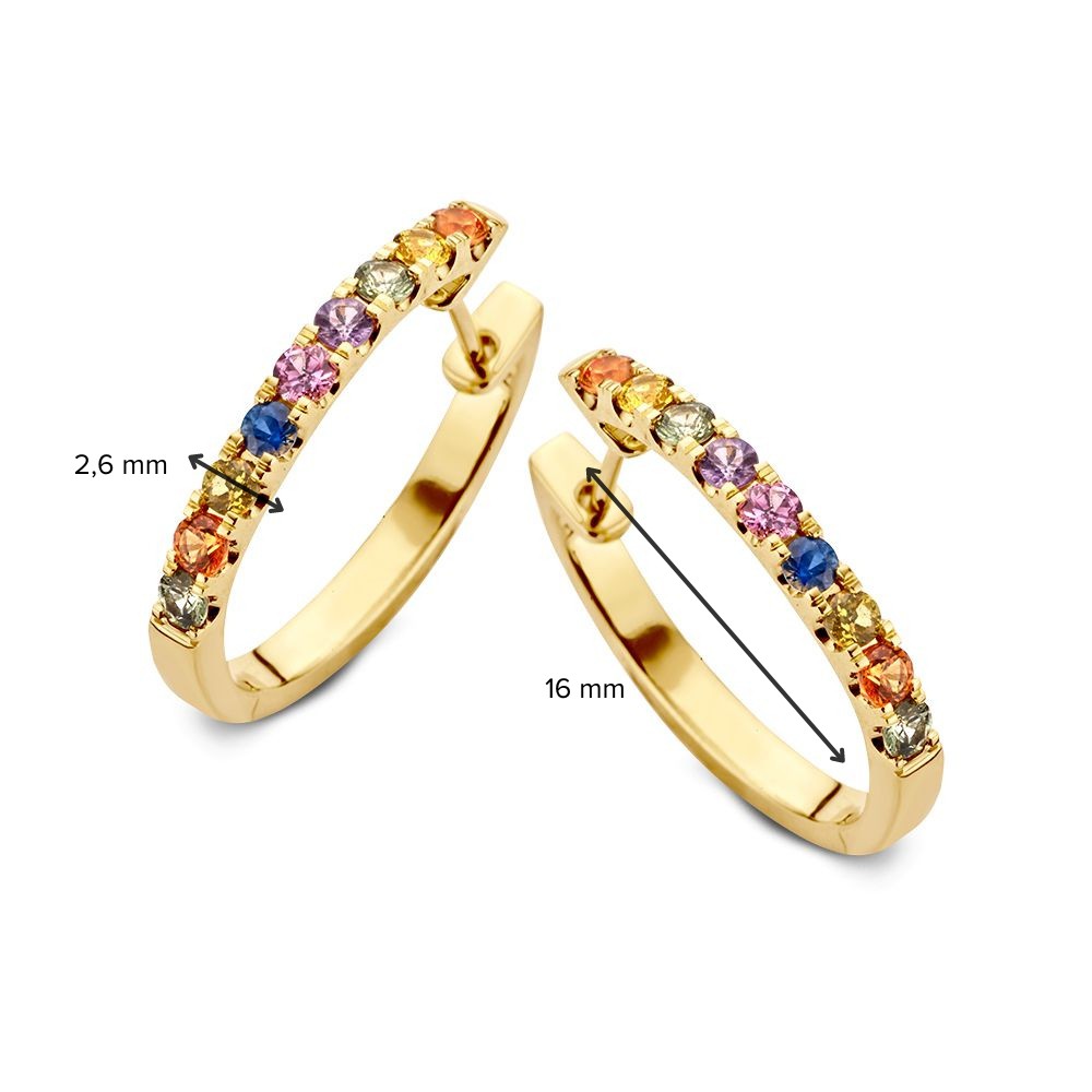 Bijzondere 14-karaats geelgouden oorringen met vrolijk gekleurde rainbow sapphire. Totaal 1.18 crt.