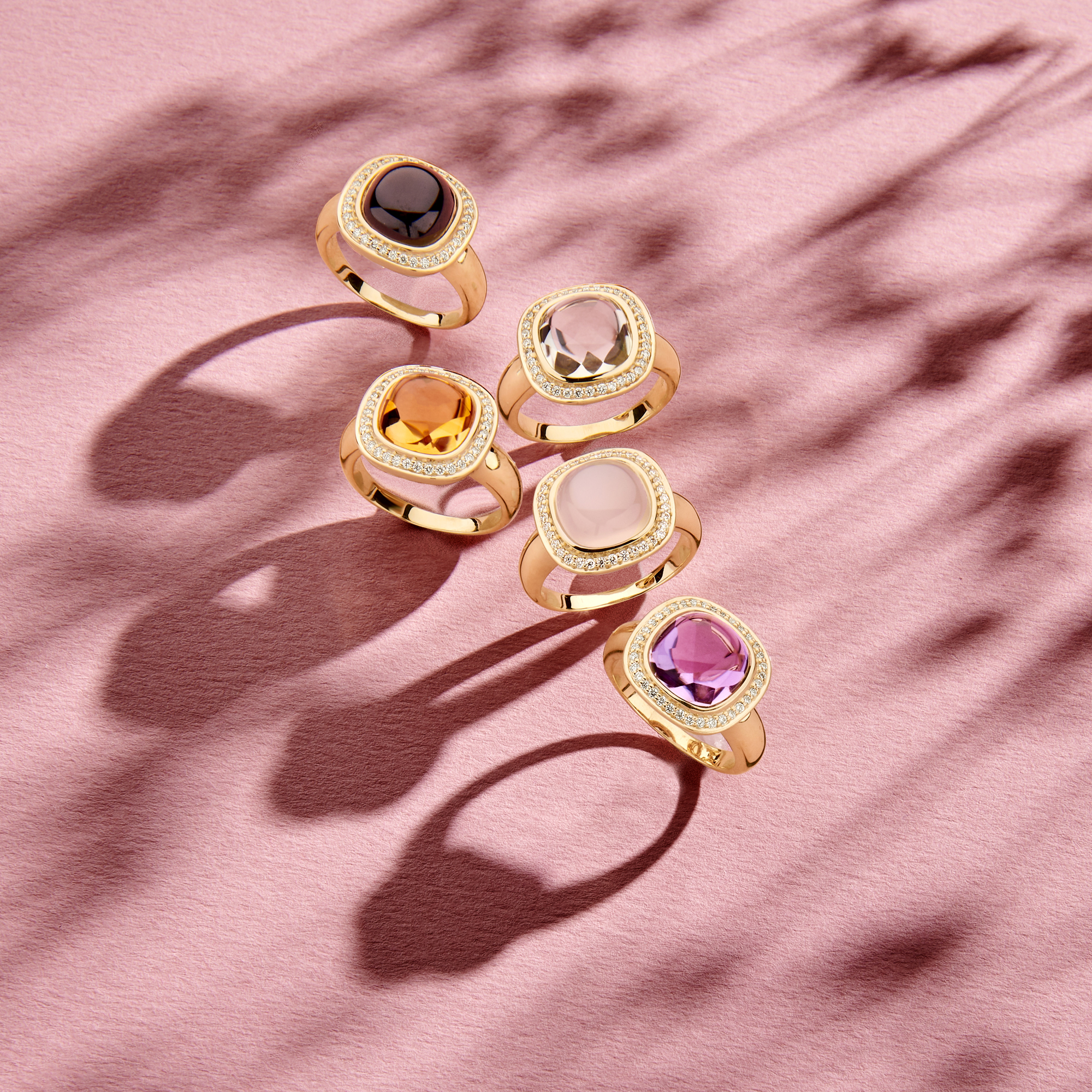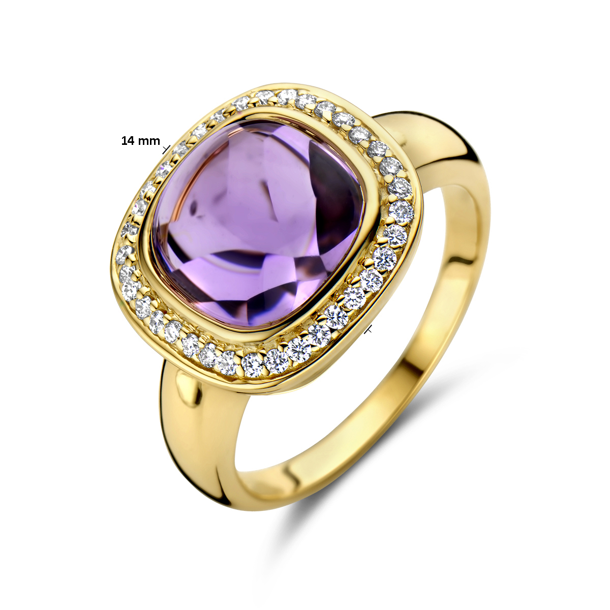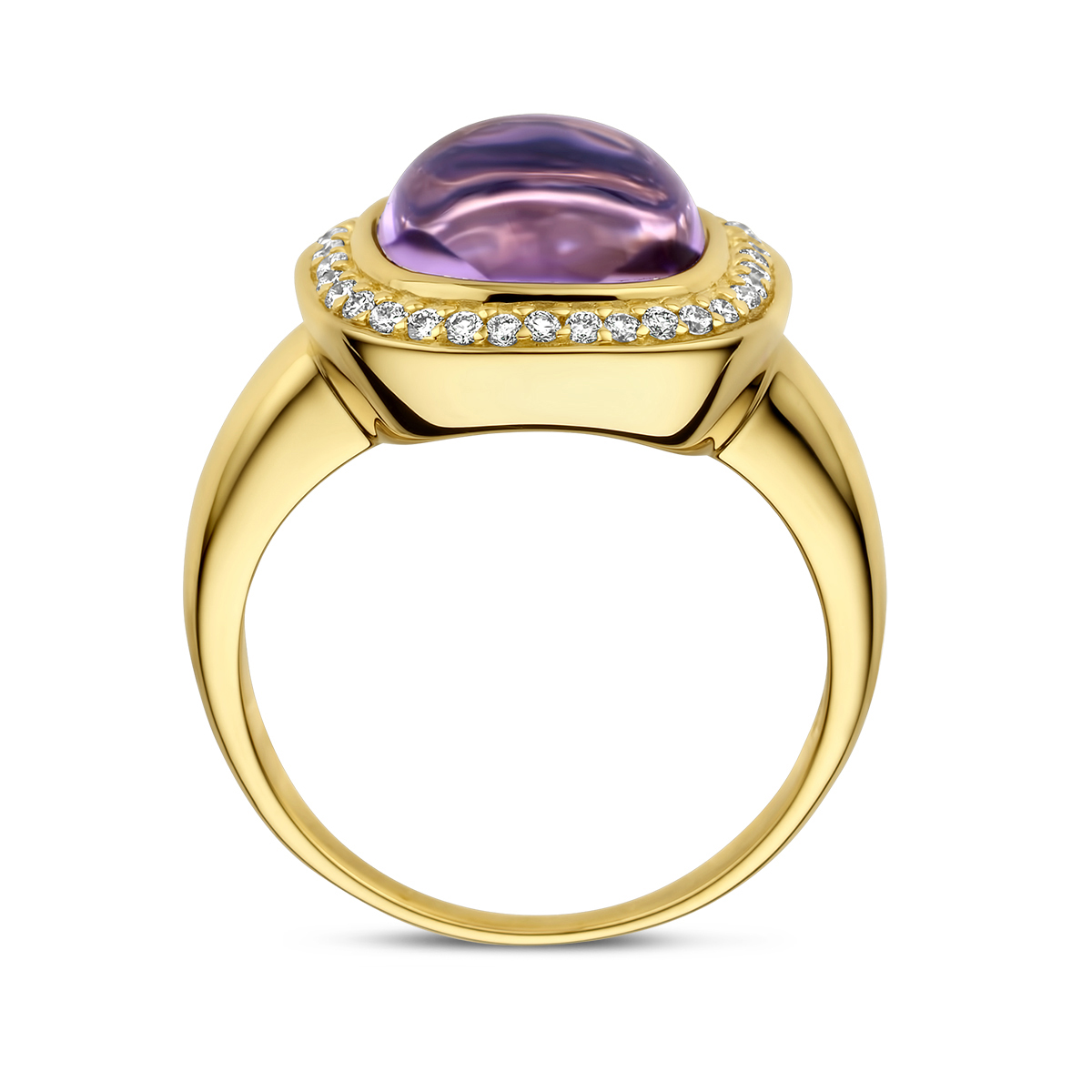 14k Geelgouden ring uitgevoerd met amethist en diamanten. De amethist heeft een cushion vorm en is aan de bovenzijde cabochon en aan de onderzijde briolet geslepen. De ring heeft een breedte van 14mm.