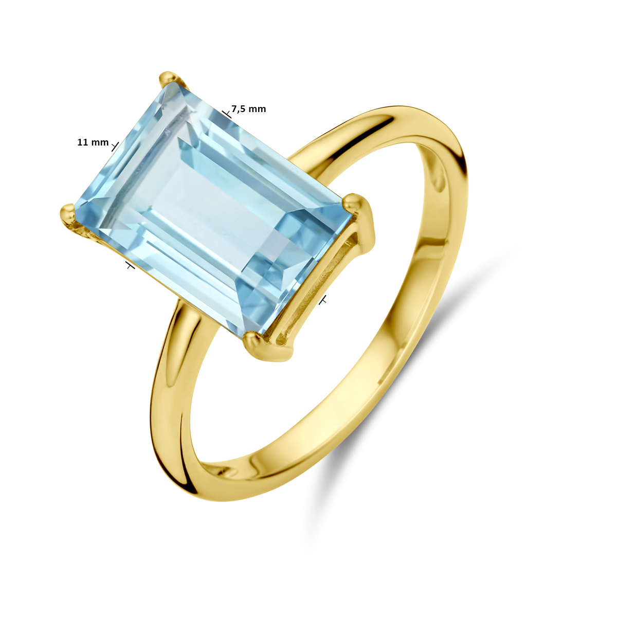 14k Geelgouden ring uitgevoerd met blauw topaas. De ring heeft een breedte van 12mm.