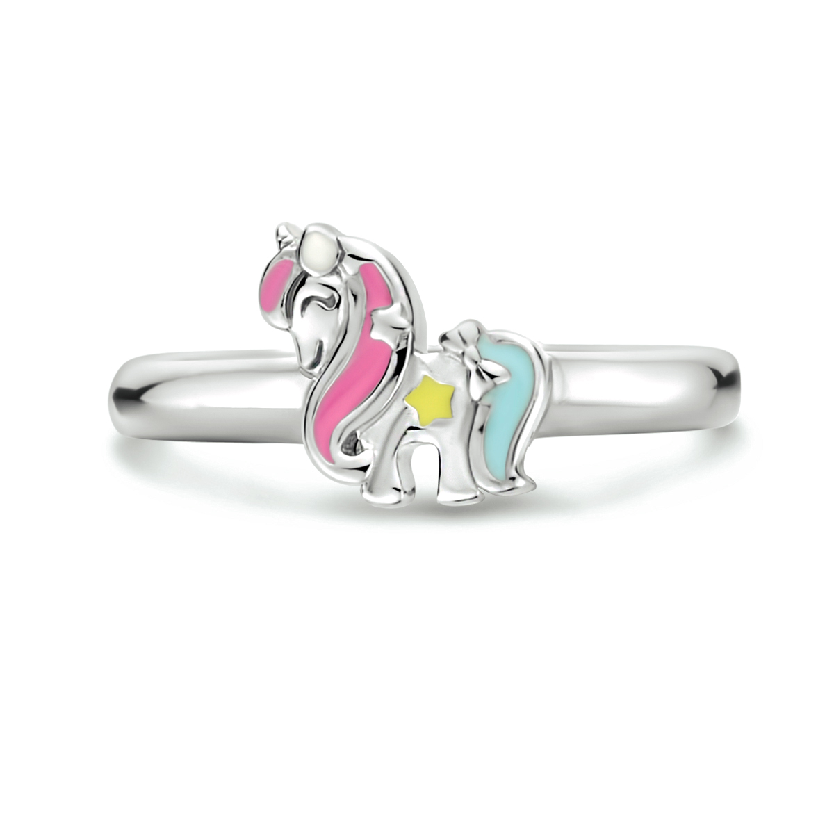 Gerhodineerd 925 zilveren ring uitgevoerd met een eenhoorn. De ring heeft een breedte van 7.5mm.
