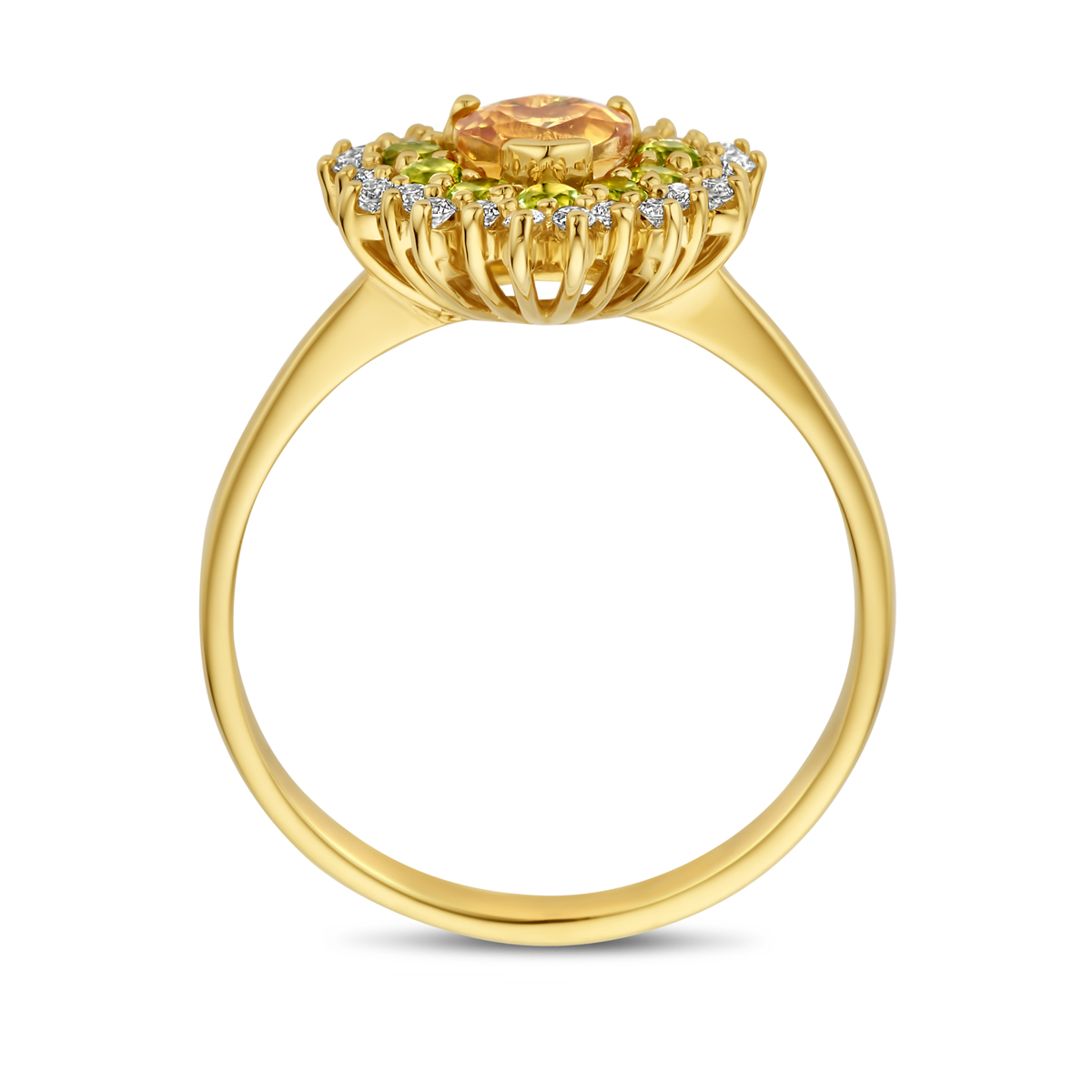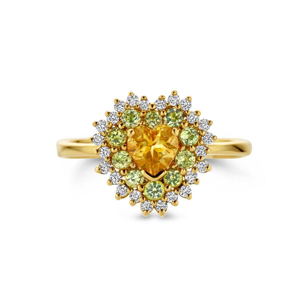 14k Geelgouden ring uitgevoerd in de vorm van een hart met peridot, citrien en diamant. De ring heeft een breedte van 12.5mm. Het totale diamantgewicht is 0.19ct.