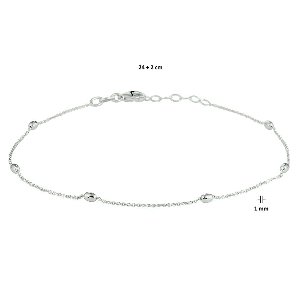 Trendy gerhodineerd zilveren enkelbandje uitgevoerd met poli afgewerkte ovaal gevormde bolletjes met afmetingen van 2.5x3.6mm. Met een draaglengte van 24cm en een extensie van 2cm.  De schakelbreedte is 1.0mm. Het enkelbandje heeft een karabijn sluiting. Tip: Leuk om kado te geven! Info: Gerhodineerd zilver is door de rhodiumlaag beter bestand tegen verkleuren en krassen.